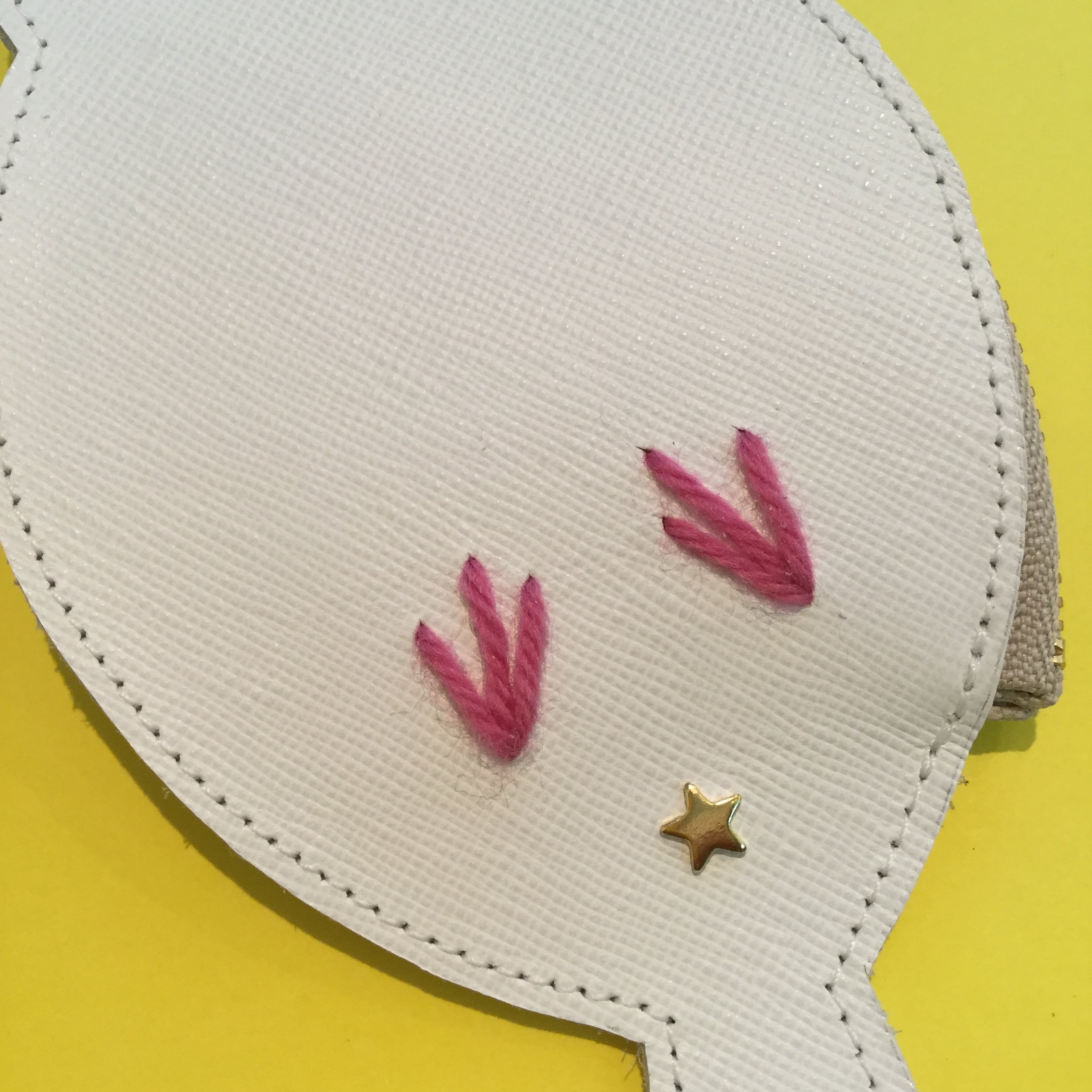 ことりのパスケースの下から見た鳥バージョンです。ピンクの足は毛糸の刺繍です。張りのある型押しの革で作りました。